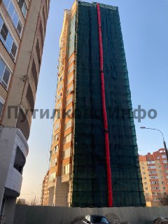 Ход ремонта обрушившегося фасада дома 6 по Братцевской улице. Жители сообщают, что неделю назад закончили ставить и накрыли сеткой леса на двух торцах дома, но на этом всё остановилось.