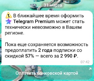 Возможно, скоро оплата товаров и услуг банковскими картами в России станет недоступна, или Телеграм полностью отключит функционал для нас.