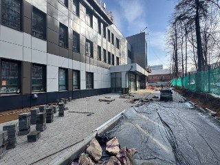 На площадке задействовано 45 рабочих и 3 единицы техники. Строители завершают фасадные работы и устройство входной группы, ведут укладку тротуарной плитки. В здании ведется чистовая отделка помещений, электромонтажные работы, пусконаладка инженерных сетей и уборка помещений. Строительная готовность более 85%.