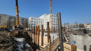 Рабочие уже смонтировали шпунтовое ограждение и залили фундаментную плиту. Сейчас возводят стены и перекрытие подвала.